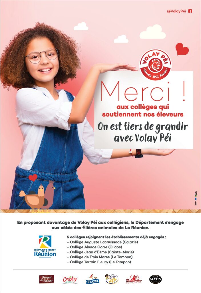 Depuis 2016, le Département et la Région sont partenaires des Conventions Volay péi afin de mettre en avant la filière volaille locale dans les restaurants scolaires des collèges et lycées.