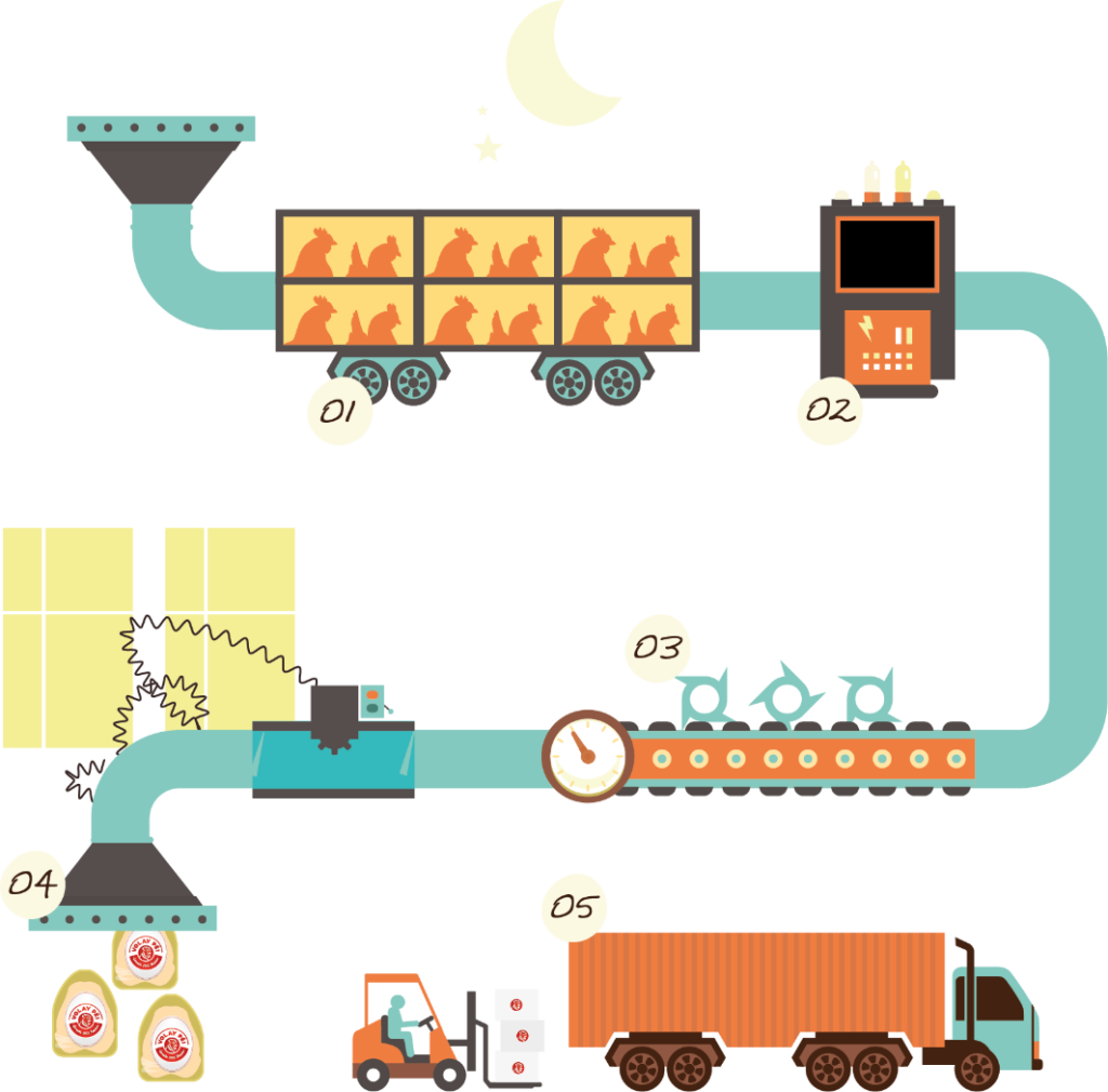 Volailles transportées et manipulées dans le calme Nombre de volailles par caisse réduit Transport nocture pour limiter le stress